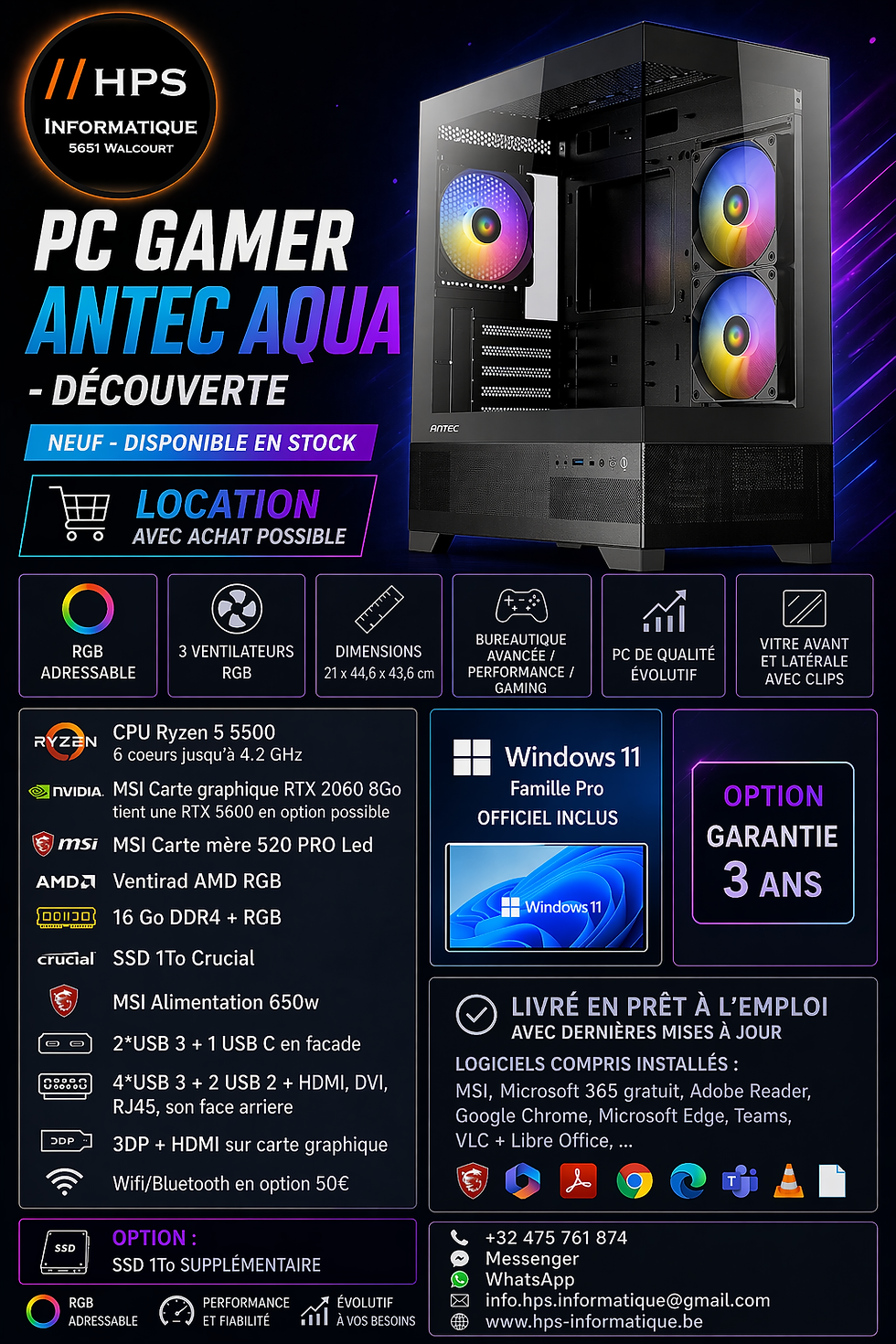 PC Gamer ANTEC Aqua Découverte RGB 1To R5 16Go RTX 2060 Super 8Go